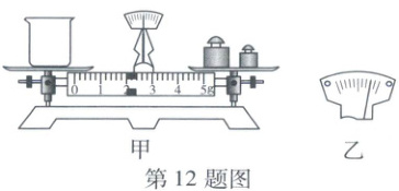12. 小明想用天平称出20g水,先用正确的方法测出空烧杯的质量,如图甲所示,然后在右盘中增加20 g砝码,接着向烧杯中注人一定量的水,指针位置如图乙所示。接下来的操作应该是