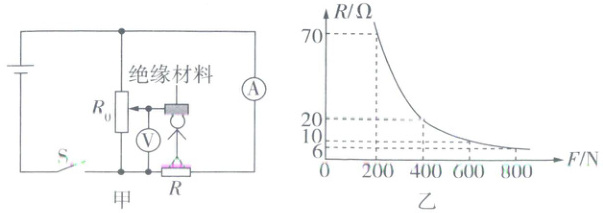 15. 新情境 制作身高体重测量仪 如图是实践活动小组的同学制作的一种身高体重测量仪,其中R₀是滑动变阻器,R为压敏电阻,R的阻值随压力变化的关系图像如图乙所示,该装置可以测量的身高范围是1.4~2m,电源电压为