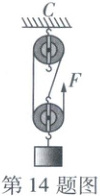 14. 如图所示,工人用两个相同的滑轮组成的滑轮组提升重540N的物体,所用的拉力F为200N,物体以0.2m/s的速度匀速上升了10s。不计绳重及摩擦,则下列说法正确的是