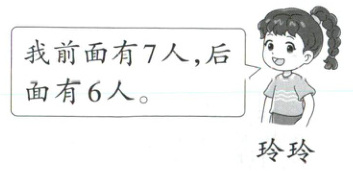 [点拨]解决这个问题时可以先画图,然后用数一数的方法。用△表示玲玲本人,她前面有7人,后面有6人,画图表示为前○○○○○○○△○○○○○○后,数一数可知,这一队一共有14人。