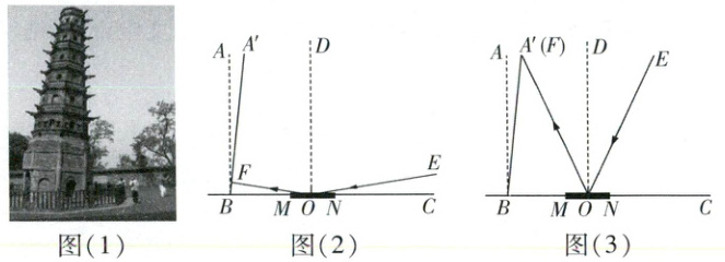 新课标 跨学科试题 如图(1)是被称为"世界第一斜塔"的定林寺塔,其抽象示意图如图(2)所示,塔身AB倾斜$\alpha$后得到塔身$A'B$,倾斜度超过闻名于世的意大利比萨斜塔.嘉嘉去定林寺塔参观时,想利用光的反射来测量定林寺塔原来的高度.将平面镜MN放置在水平地面BC上,一束光线EO照射到镜面MN上,反射光线OF照射在塔身$A'B$上.当入射角$\angle DOE = 84.7^{\circ}$时,反射光线OF恰好与塔身$A'B$互相垂直,垂足为F.