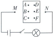 6. 新情境 连接线桩 如图,暗箱内有一根导线将左边接线桩A,B,C中的某个与右边接线桩D,E,F中的某个相连.现用一根导线将接线桩M与A,B,C中的某个相连,再用另一根导线将接线桩N与D,E,F中的某个相连,连好后,闭合开关,小灯泡能发光的概率是 (