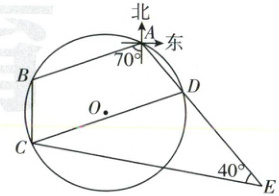 如图,某园林中A,B,C,D四个亭子(可看作四个点)在$\odot O$上,且亭子B在亭子A的南偏西$70^{\circ}$方向上,亭子C在亭子B的正南方向上.该园林管理部门计划在AD的延长线上再修建一个亭子E,使$DE = 500m$,测得此时$\angle AEC = 40^{\circ}$.