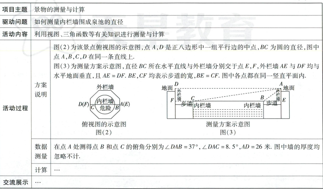 如图(1),"源池泉涌"为我省某景区的一个景点,主体设计包括外栏墙与内栏墙,外栏墙高于内栏墙,两栏中间为步道,内栏墙内为泉池,池内泉水清澈见底.从正上方看,外栏墙呈正八边形,内栏墙呈圆形.综合实践小组的同学围绕"景物的测量与计算"开展项目学习活动,形成了如下活动报告.