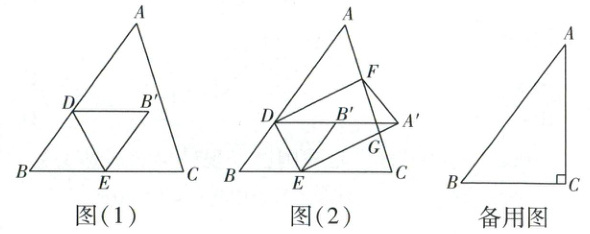 如图(1),在$\triangle ABC$纸片中,$AB>BC$,点$D$在边$AB$上,$AD>BD$.沿过点$D$的直线折叠该纸片,使$DB$的对应线段$DB'$与$BC$平行,且折痕与边$BC$交于点$E$,得到$\triangle DB'E$,然后展平.