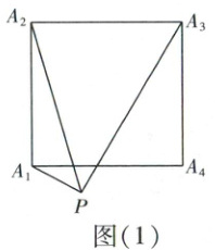如图(1),已知P是正方形$A_{1}A_{2}A_{3}A_{4}$外一点,且满足$\angle PA_{1}A_{2}+\angle PA_{3}A_{2}=180^{\circ}$,探究$PA_{1}$,$PA_{2}$,$PA_{3}$三条线段的数量关系.