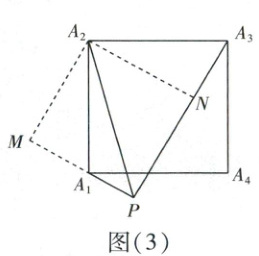 思路二:如图(3),构造$\triangle MA_{1}A_{2}$与$\triangle NA_{3}A_{2}$全等,从而得出$PA_{1}+PA_{3}$与$PA_{2}$的数量关系.