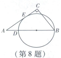 8. 如图,在Rt△ABC中,∠C = 90°,D为斜边AB上一点,以DB为直径的圆与AC相切于点E. 若AD = 5,AE = 10,则BC的长是(