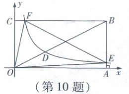10. 如图,D为矩形OABC(边OA,OC分别在x,y轴的正半轴上)对角线OB上的点,且OD = $\frac{1}{2}$BD. 经过点D的反比例函数y = $\frac{k}{x}$的图象分别与AB,BC相交于点E,F,连接OE,OF,EF. 若△OBF的面积是24,则△OEF的面积为(