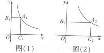 14. 如图(1),点$A_{1}(x_{1},y_{1})$是函数$y=\frac{1}{x}(x > 0)$图象上任意一点,过$A_{1}$向$y$轴作垂线交$y$轴于点$B_{1}$,向$x$轴作垂线交$x$轴于点$C_{1}$,矩形$A_{1}B_{1}OC_{1}$的周长$L_{1}=2(A_{1}B_{1}+A_{1}C_{1})=2(x_{1}+y_{1})=2(x_{1}+\frac{1}{x_{1}})$.当$x_{1}=\frac{1}{x_{1}}$时,$L_{1}$有最小值4;如图(2),点$A_{2}(x_{2},y_{2})$是函数$y=\frac{2}{x}(x > 0)$图象上任意一点,同样作矩形$A_{2}B_{2}OC_{2}$,它的周长$L_{2}=2(x_{2}+\frac{2}{x_{2}})$,同理得$L_{2}$的最小值为$4\sqrt{2}$;$·s$;点$A_{n}(x_{n},y_{n})$是函数$y=\frac{n}{x}(x > 0,n$为正整数)图象上任意一点,作矩形$A_{n}B_{n}OC_{n}$,它的周长为$L_{n}$,则$L_{n}$的最小值为