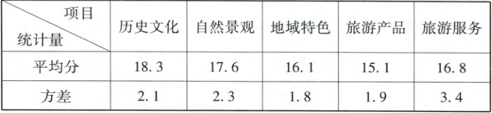 信息二 100名游客对本市历史文化、自然景观、地域特色、旅游产品、旅游服务打分的平均分和方差如表: