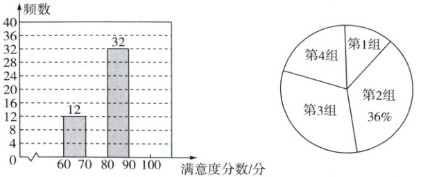 信息一 每名游客对五个项目打分之和记为满意度分数,满意度分数用$x$表示(单位:分,$x \geq 60$),将满意度分数数据分成如下四组:第1组$60 \leq x < 70$,第2组$70 \leq x < 80$,第3组$80 \leq x < 90$,第4组$90 \leq x \leq 100$. 以下是满意度分数的频数分布直方图和扇形统计图的部分信息.