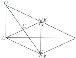 如图,已知线段$AB$,分别以端点$A$,$B$为圆心,以大于$\frac{1}{2}AB$的长为半径作弧,两弧交于$E$,$F$两点,分别连接$AE$,$BE$,$AF$,$BF$,$EF$.若点$C$为$AE$的中点,连接$FC$并延长,与$BE$的延长线交于点$D$,连接$DA$.求证:$DA⊥AB$.