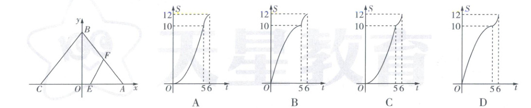 10. 如图,已知$\triangle ABC$的顶点坐标分别为$A(3,0),B(0,4),C(-3,0)$.动点$E,F$同时从点$A$出发,$E$沿$A→C$运动,$F$沿折线$A→B→C$运动,均以每秒1个单位长度的速度移动,当一个动点到达终点$C$时,另一个动点也随之停止移动,移动时间记为$t$秒,连接$EF$.当点$E,F$移动时,记$\triangle ABC$在直线$EF$右侧部分的面积为$S$,则$S$关于时间$t$的函数图象为 (