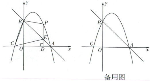 (3)若点$P$为抛物线上$y$轴右侧的一点,点$P$的横坐标为$m$,过点$P$作$x$轴的垂线,垂足为$D$,与直线$AB$交于点$E$,连接$PB,BC,CE$,是否存在点$P$,使得$\frac{S_{\triangle PBE}}{S_{\triangle BCE}} = \frac{3}{8}$?若存在,求出此时点$P$的横坐标;若不存在,说明理由.