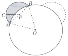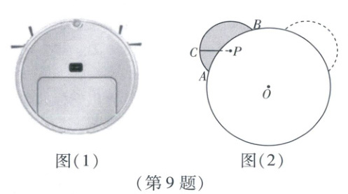 9. 新素材 扫地机器人 如图(1)是一款带毛刷的扫地机器人,图(2)是其示意图,机身$\odot O$的直径为40 cm,毛刷的一端为固定点P,另一端为点C,$CP=10 \mathrm{~cm}$,设工作时毛刷CP绕点P旋转形成的圆弧交$\odot O$于点A,B,且点A,P,B在同一直线上,则图中阴影部分的面积为