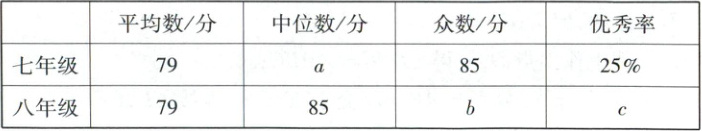 (2)八年级的成绩更好。理由:虽然两个年级学生成绩的平均数和众数均相同,但是八年级学生成绩的中位数和优秀率均高于七年级,故八年级的成绩更好。 (7分)