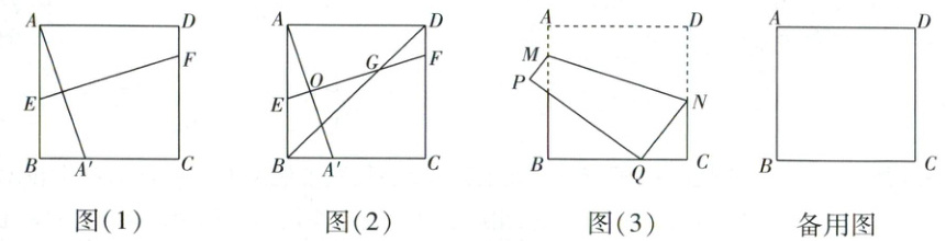 如图(1),将正方形ABCD折叠,使点A的对应点$A'$落在BC边上,折痕分别与AB,CD交于点E,F,则折痕EF和$AA'$的数量和位置关系分别是