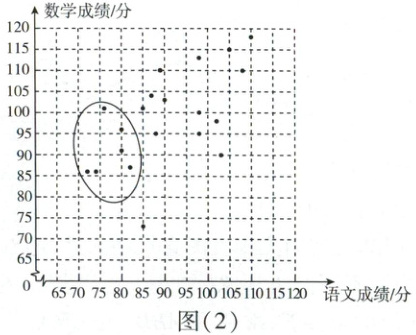 c. 这20名学生的语文成绩和数学成绩得分统计如图(2)(共20个点).