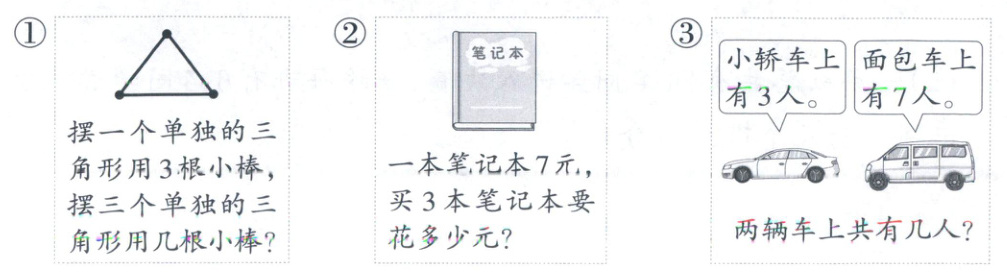 4. 下面各图中,不能用$5×2 + 3$计算的是()。