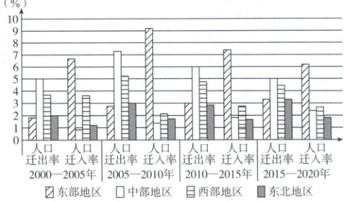 [河南省实验中学 2025 高一月考]人口迁移是区域人口结构、城镇化进程和社会经济发展水平的重要影响因素。第七次全国人口普查数据显示,1985—2020 年中国省际人口迁移规模从约 1100 万人增加至 5168 万人,而中国常住人口城镇化率也在 2020 年末达到 63.89%。下图示意 2000—2020 年中国各区域人口迁出率、人口迁入率,其中人口净迁出率=人口迁出率 - 人口迁入率。据此完成下面小题。
