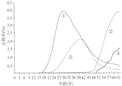 5.A 【解析】本题考查人口迁移的原因。结合图示信息可知,①曲线27到33岁人口迁移率最高,该部分人群处在婚育高峰期,婚育人群多选择迁入配偶户籍地,故①为婚姻嫁娶;③曲线39到42岁人口迁移率最高,该部分人群的子女多为学生,为获取优质教育资源,家庭可能迁入教育强区,故③对应为子女就学;②④曲线60~63岁迁移率高,60岁左右人群多处于退休初期,可迁移至子女居住地帮助照料孙辈,同时,部分老年人选择迁往生态环境优越或经济发达的地区养老,但因经济门槛和乡土情结,迁移规模较小,迁出率低于照料孙辈群体,故②为照料孙辈,④为养老。B、C、D错误,A正确。