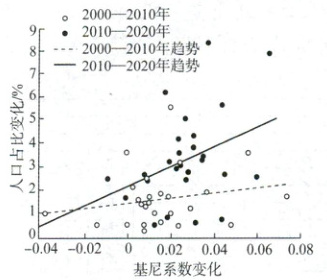 [福建晋江2024高一月考]人口分布基尼系数能反映人口分布的集中程度,基尼系数最大为1,最小为0,基尼系数越接近0表示人口分布越均衡。下图示意2000—2020年我国部分省级行政区基尼系数变化与其行政中心人口占比变化关系。据此完成下面小题。