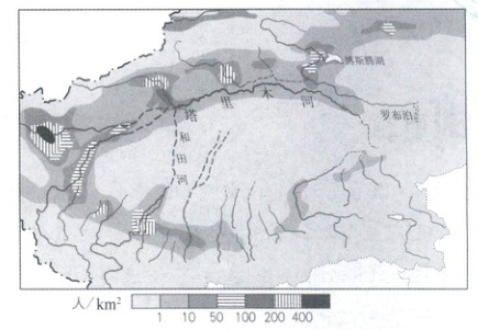 (1)本题考查人口分布特征及原因。根据图中信息可以看出,南疆人口分布不均,主要沿河流分布,而这些地带又主要是山麓绿洲地带。这些地区有高山冰雪融水汇集形成河流,水源充足;流水堆积形成冲积扇,地形平坦、土壤肥沃,物产丰富,能满足人们的生活生产需求。【特征分析类】