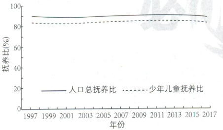 [山东 2025·6~7]下图示意某人口大国 1997~2017 年人口总抚养比和少年儿童抚养比的变化。据此完成下面小题。