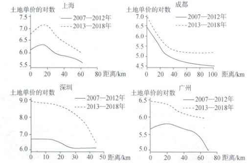 4.D 【解析】本题考查城市空间结构的特征。 功能区布局的延续性主要表现为功能区在时间维度上的稳定性和继承性,工业用地出让价格空间分布主要反映的是不同位置的土地价格差异,不能直接体现功能区布局的延续性 A错误 图中主要展示的是工业用地出让价格与距市中心远近的关系,交通对地价的影响在图中没有直接体现 B错误 各功能区分布密度需通过功能区面积、数量等综合衡量,工业用地出让价格空间分布不能直接反映各功能区分布密度 C错误 从图中不同阶段工业用地出让价格变化可知,随着城市从单中心向多中心演变,地价的空间分布情况发生改变,能直接反映空间集聚的演变趋势 D正确 5.A 【解析】本题考查城市内部空间结构变化的影响。上海市由单中心向多中心演变,产业在次级中心集聚后会形成新的 突破点:次级中心发展,会吸引产业集聚地租梯度,A正确。传统市中心地价原本就较高,城市向多中心演变不会在传统市中心形成新的价格峰值,B错误。地价不会沿环城高速呈现均匀递减分布,因为不同位置的发展程度、产业集聚等情况不同,C错误。图中未体现受环境因素影响形成跳跃式分布,工业用地出让价格主要与距市中心远近和城市中心演变相关,D错误。
