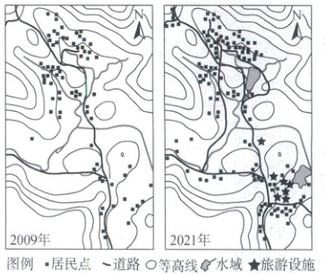 6.C 【解析】本题考查影响乡村空间形态的因素。据图文材料可知,村落空间布局产生明显变化,增加了多个旅游设施,形成了以条带式、组团式为主的村落形态,逐步实现“居住—旅游—景观”空间协调发展,说明崇木凼村空间形态发生变化的 黑板:该村落位于虎形山国家级重点风景名胜区的核心区域直接驱动因素是旅游开发,C正确;崇木凼村地处湖南省虎形山国家级重点风景名胜区的核心区域,农业发展、矿产开采和对外开放都不是直接驱动因素,A、B、D错误。 7.D 【解析】本题考查读图分析能力。据图分析可知,东南部区域乡村旅游的发展产生大量居住需求,修建度假民宿和游客接待中心形成新的组团,①正确;由于西北部地区人口增加,原有建筑已不能满足居住的需求,在原有建筑周边营建了新的建筑,③正确,东北部地区无居民点分布,②错误;西南部形成了沿道路的条带式村落形态,④错误。综上,故选D。