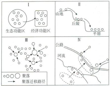 1. [四川成都石室中学2025高一期中]随着乡村振兴战略的有效实施,我国乡村聚落空间分布发生了明显变化。下图为江南丘陵某区域四种乡村聚落空间演化模式示意图。据此完成下题。