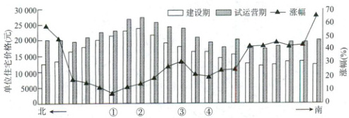 2. [广东梅州2024高一期中]某省会城市的地铁1号线大致呈南北走向纵跨城市中心区和边缘区。下图示意1号线建设期和试运营期沿线各站点周边的住宅平均价格及其增幅。读图,完成下面小题。