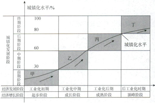 [教材变式][安徽六安一中2024高一月考]据国家统计局消息,2023年末,我国城镇常住人口93267万人,比上年末增加1196万人,城镇人口占全国人口的比重(城镇化率)为66.16%,比上年末提高0.94个百分点。根据经济状况,城镇化可分为以下四个阶段。据此完成下面小题。