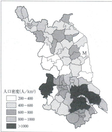 4.D 【解析】本题考查影响人口分布的因素。M地位于江苏省东部沿海地区,属于南北气候过渡地带,气候温和湿润,地形以平原为主,地势低平,多盐碱地、沼泽,不利于农业发展,因此人口密度相对较小。A、B、C错误,D正确。