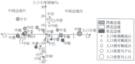 对比中国边境内外的人口丰度数值可以看出,中国边境外人口丰度在0.5 - 1.5的地区远多于中国边境内,所以中国边境内的人口丰度整体是低于边境外地区的,D错误。西南边境(如中越)地区的人口丰度较高,且中国边境内,与越南接壤地区属于人口密度均上区,A错误。东北边境地区接壤国为俄罗斯和朝鲜,从右侧图例中的圆圈大小可以看出中国边境内,中俄、中朝的人口丰度为人口绝对稀疏区和人口密度均下区,C正确。与西北边境地区接壤的哈萨克斯坦、吉尔吉斯斯坦、塔吉克斯坦,在中国边境内对应的人口丰度较低,且圆圈较小,属于人口稀疏区,B错误。