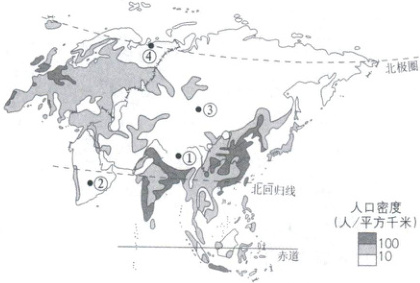 2.D 【解析】本题考查影响人口分布的因素。根据所学知识可知,①地位于青藏高原地区,海拔高,气温低,高寒的自然环境不适合人类居住,是人口稀疏地区,A错误;②地位于西亚的阿拉伯半岛,属于热带沙漠气候,炎热干旱的自然环境不适合人类居住,人口稀疏,B错误;③地位于亚欧大陆内部,属于温带大陆性气候,因深居内陆,海洋水汽难以到达,降水少,沙漠广布,水资源缺乏,干旱的自然环境不适合人类居住,成为人口稀疏地区,C错误;④地地处北极圈附近,纬度高,气候严寒,不适合人类居住,成为人口稀疏地区,D正确。