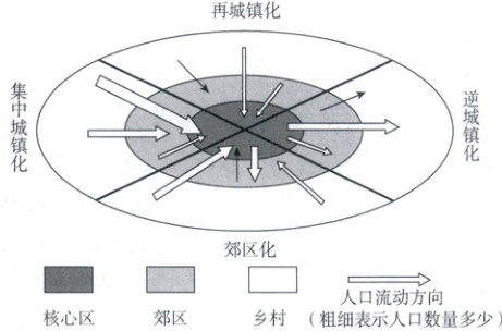 1.A 【解析】本题考查城镇化的进程。结合所学知识和图文材料可知,城镇化进入郊区化阶段,大量乡村人口和城市核心区人口迁入郊区,虽然也有人口迁入城市核心区,但是数量较少,因此郊区增长的人口数量高于城市核心区,A正确;郊区化阶段郊区内迁出人口数量较少,B错误;图中显示郊区化阶段郊区迁入人口主要来自城市核心区,C错误;郊区人口少量迁入城市核心区,但没有向周边乡村迁移,D错误。