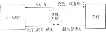[云南大理2025高一质量检测]区域城镇化进程伴随着各种经济要素在城市之间、城市与乡村之间流动,大中小城市经济要素的良好分配又会促进城乡协调,区域协调,有利于提高区域城镇化水平,促进区域经济发展。下图示意城镇化机制下,不同类型聚落之间经济要素流动。据此完成下面小题。