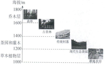 [北京交通大学附属中学2025高一期中]2023年9月17日,云南“普洱景迈山古茶林文化景观”申遗成功,成为全球首个茶主题世界文化遗产。“普洱景迈山古茶林文化景观”包含5片规模宏大、保存完好的古茶林和分布其中的9个古村寨以及古茶林之间的3片分隔防护林。下图为景迈山林下种植立体结构和景迈山土地垂直利用示意图。读图,完成下面小题。