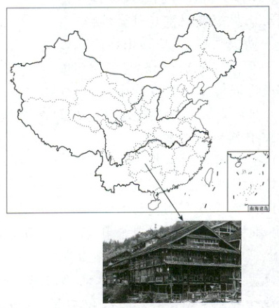 材料三 下图为西江千户苗寨所在的位置及吊脚楼景观图。