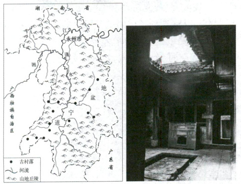 [江苏扬州一中2025高一期中]道宁盆地位于湖南西南部永州市境内,地处湖南、广东、广西三省级行政区交界处,有近500个古村落密集分布于此。道宁盆地先辈们在建造住宅时,选择了“靠山而处,择木而居”理念,民居多采用高屋脊、大进深、多天井的做法来适应当地的气候,是人们世代赖以生存的宝地。下图为道宁盆地古村落位置图及古宅天井景观图。据此完成下面小题。