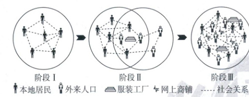 从阶段Ⅰ到阶段Ⅲ,阶段Ⅰ属于本地居民内部联系,阶段Ⅱ本地居民与外来人口形成新的社会关系网,阶段Ⅲ本地居民与外来人口互相联系,形成更加多元化的社会关系,B错误,D正确。