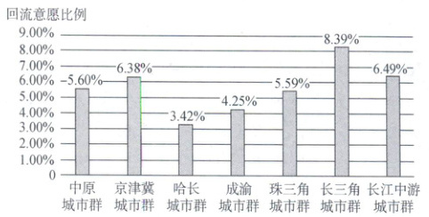 [天津南开中学2025高一期末]随着乡村振兴政策的实施,我国人口出现了较明显的“逆向流动”现象。下图为我国不同城市群流动人口从城市向乡村回流意愿统计图。据此完成下面小题。