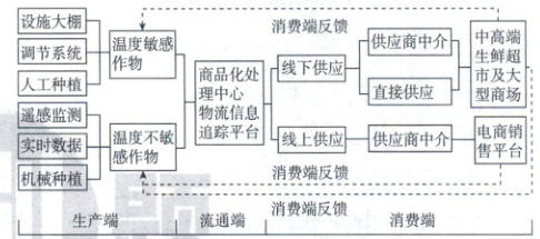 [创新优题][山东枣庄一中 2024 高一期中]四川省甘孜藏族自治州理塘县位于青藏高原东南缘,近年来与东部发达地区合作,大力发展数字化果蔬种植,成立甘孜藏族自治州首个现代数字农业园区——理塘濯桑果蔬数字化农业园区。园区全程采用数字化跟踪,现已成功栽培小番茄、白萝卜、草莓、香菇等 20 余个品种,产品主要销往港澳台中高端大型生鲜超市,走出了一条乡村振兴的新道路。下图示意理塘濯桑果蔬数字化农业园区产业链。据此完成下面小题。