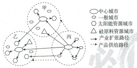 3 D 【解析】本题考查工业布局特点。依据太阳能资源城市与产业扩张路径可知,丙为主要转出区,缺乏太阳能和硅原料资源,应位于东部地区,而贵州和宁夏均位于我国西部地区,太阳能丰富,B、C 错误;乙为转入区,重庆太阳能贫乏,而新疆太阳能十分关键点:重庆位于四川盆地,多云雨天气,太阳能资源不足,因此乙为新疆,A 错误,D 正确。