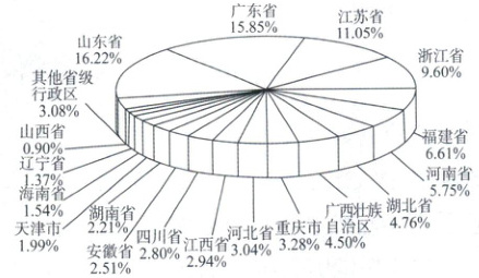 [安徽阜阳太和中学 2024 高一期中]造纸工业是制造各种纸张及纸板的工业部门,还包括用木材、甘蔗渣、稻草、麦秸、棉花等原料制造纸浆的纸浆制造业。2022 年全国纸及纸板生产量为 12 425 万吨,较上年增长 2.64%,消费量 12 403 万吨,较上年增长-1.94%,近几年造纸企业普遍承压严重。下图示意 2022 年我国省级行政区纸及纸板产量比例。据此完成下面小题。