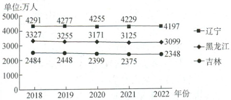 [河南郑州2025高一期末]一个地区人口数量变化与当地自然因素和社会经济因素密切相关。近年来,东北三省人口数量显著变化,对社会经济发展产生了重要的影响。下图为东北三省2018—2022年常住人口数据。据此完成下面小题。