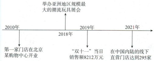 [浙江桐庐中学 2024 高一月考]P 公司成立于 2010 年,是中国领先的潮流文化娱乐公司。发展十余年来,围绕全球艺术家挖掘等五个领域,构建了覆盖潮流玩具全产业链的综合运营平台。P 公司主要售卖单价较高的盲盒玩具(即事先不知道盒子里面的具体内容)。下图为 P 公司的发展历程示意图。据此完成下面小题。