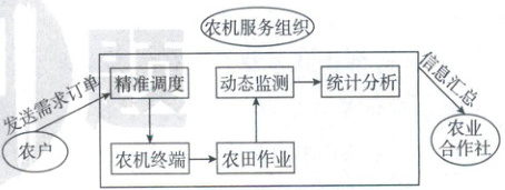 [福建泉州 2025 高一检测]某农业合作社原以农机租赁为主,服务范围局限周边 3 个村庄。2023 年转型为“全程机械化+智慧农业”服务组织,引入无人农机、物联网墒情监测系统,并与周边 10 个行政村签订托管协议,服务面积扩大至 8 万亩(1 亩≈666.67 平方米),每亩成本降低 20%、粮食增产 15%。下图示意农业合作社服务组织流程。据此完成下面小题。